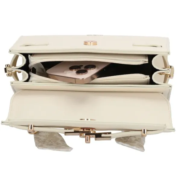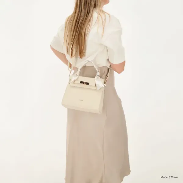 Binnenin bevindt zich een ritsvak en een telefoonvak, ideaal om je essentials overzichtelijk te bewaren. Op de voorkant zit een mooi gespdetail afgewerkt met een speels sjaaltje, wat de tas een vrouwelijke touch geeft.