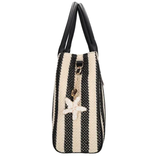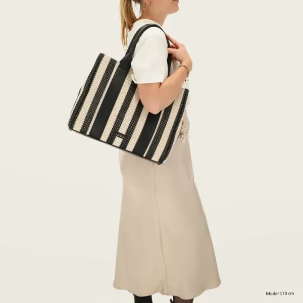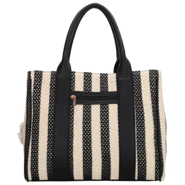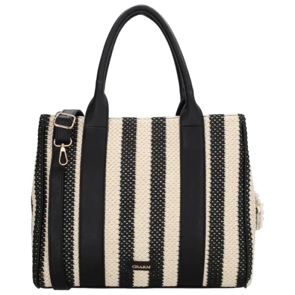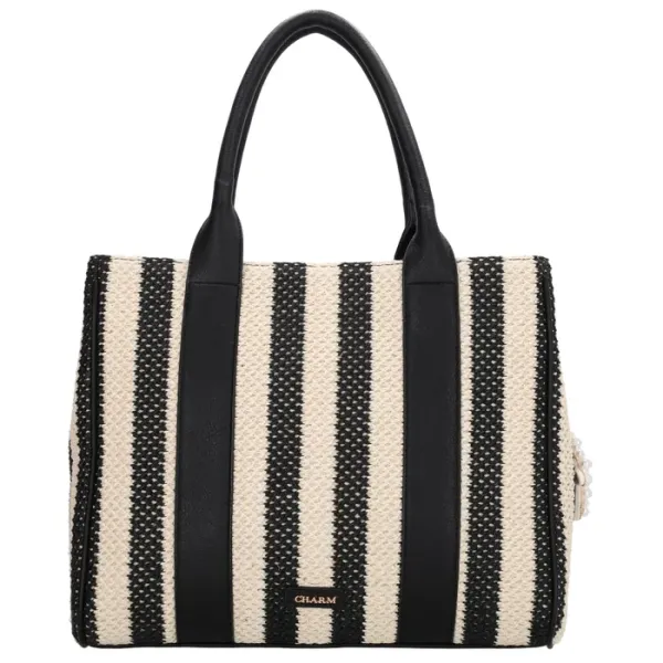 De Charm London Capri Shopper is een ruime en stijlvolle tas met een zomerse gestreepte riet look. De twee stevige handvaten maken de shopper ideaal voor dagelijks gebruik en dankzij de ritssluiting berg je je spullen veilig op. Binnenin vind je een overzichtelijke indeling met een tussenritsvak, twee insteekvakken en een ritsvak zodat je al je essentials netjes georganiseerd meeneemt.