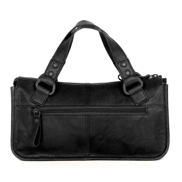 Deze handtas combineert stijl met praktische indeling. Het hoofdvak sluit veilig met een ritssluiting aan de bovenzijde en is verdeeld in twee ruime compartimenten, gescheiden door een breed ritsvak. Binnenin vind je daarnaast een extra ritsvak, een steekvak, een telefoonvak en een handig sleutellusje – alles om je spullen overzichtelijk op te bergen.